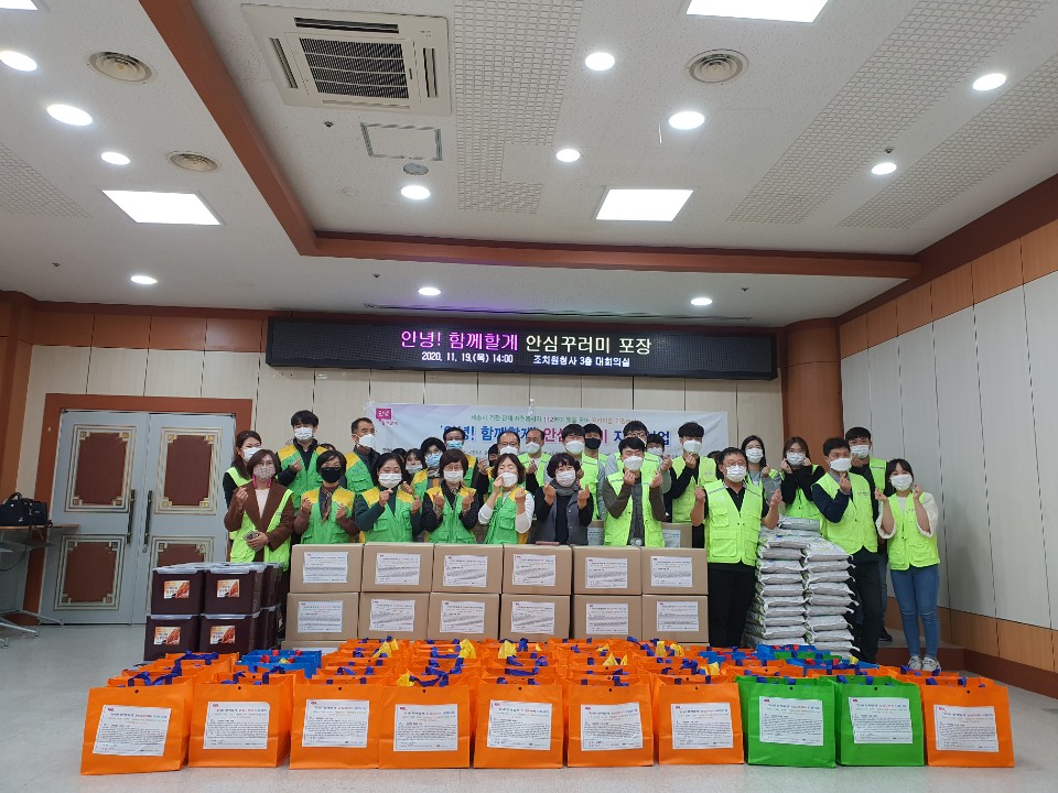 - ‘안녕! 함께할게’안심꾸러미 지원사업은 10월 29일부터 12월 17일까지 총 6회에 걸쳐 관내 저소득, 독거노인, 장애인, 한부모, 조손?다문화가정 300가구를 대상으로 밑반찬?간식지원, 생필품지원, 안부전화 등 정서지원을 하게 된다.