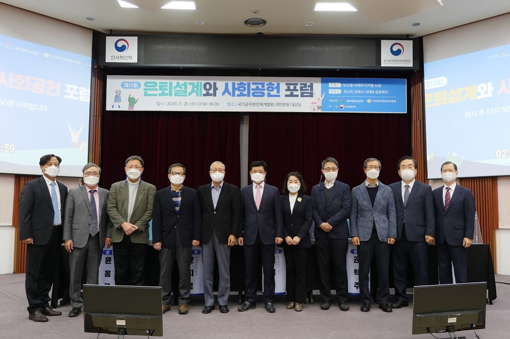 - 공무원연금공단(이사장 정남준)은 25일 국가공무원인재개발원 과천분원에서 인사혁신처의 후원아래 한국공공복지학회와 공동으로「은퇴설계와 사회공헌 포럼」을 온라인 개최했다.