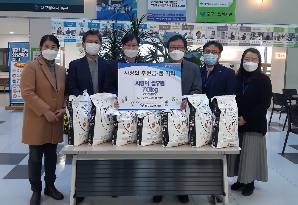 - 이날 공단 관계자 및 대구지역 퇴직공무원으로 구성된 대경상록자원봉사단 6명은 대구중구보건소 직원을 위해 구내식당을 운영하고 있는 대구중구노인복지관을 찾아 쌀 7포대를 직접 전달하였다.