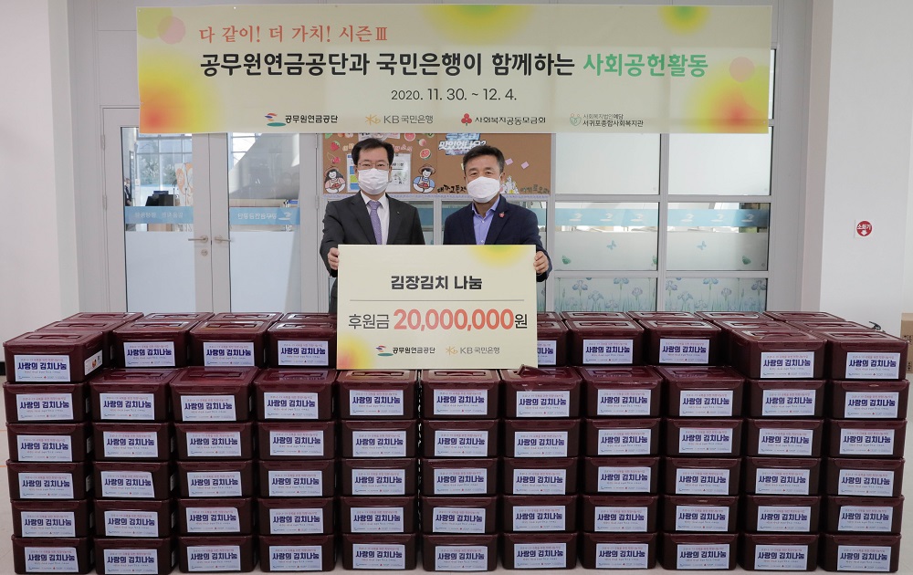 - 공무원연금공단(이사장 정남준)은 지역사회 복지향상 및 나눔문화 확산을 위해 서귀포지역 독거노인 가구 400세대를 대상으로 2천만원 상당의 김장김치를 전달했다고 2일 밝혔다.