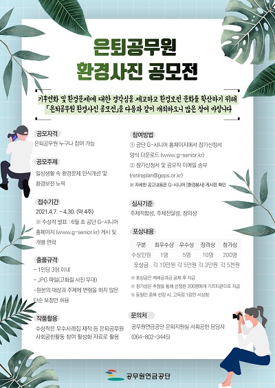 - ‘은퇴공무원 환경사진 공모전’은 은퇴공무원 누구나 참여 가능하며, ‘일상생활 속 환경문제 인식개선 및 환경보전 노력’을 주제로 진행한다. 접수기간은 4월 7일부터 4월 30일까지며, 참가신청서와 공모작을 이메일(retireplan@geps.or.kr)로 전송하면 참여 가능하다. 참가신청서는 G-시니어 홈페이지(www.g-senior.kr)에서 내려받을 수 있다.